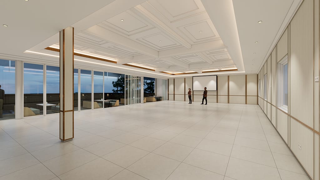 Ruang indoor luas dengan sentuhan hangat dan tetap menyuguhkan pemandangan kota. Lebih privat dan ideal untuk acara yang membutuhkan fokus.